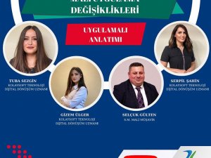 Kolaysoft Teknoloji AŞ Dijital Dönüşüm Uzmanı Gizem Ülger, Kolaysoft Teknoloji AŞ Dijital Dönüşüm Uzmanı Serpil Şahin ve Kolaysoft Teknoloji AŞ Dijital Dönüşüm Uzmanı Tuba Sezgin moderatörlüğünde, S.M Mali Müşavir Selçuk Gülten ve webinarın düzenlendiği ilin mali müşavirler odası yöneticilerinin katılımıyla toplantılar gerçekleşiyor. Yoğun katılımın olduğu webinarlarda, S.M Mali Müşavir Selçuk Gülten tarafından, 2021’de E-Fatura’ya geçmek zorunda olan sektörler ve firmalar hangileridir, E-Adisyon uygulamasına geçiş, döviz alım satım belgesi düzenleyen firmalara E-Döviz alım satım belgesi düzenleme imkanı getirilmesi ve özel sektöre mali mühür üretim izni verilmesi gibi bu yılın içinde uygulamaya alınacak konular hakkında bilgiler veriliyor.