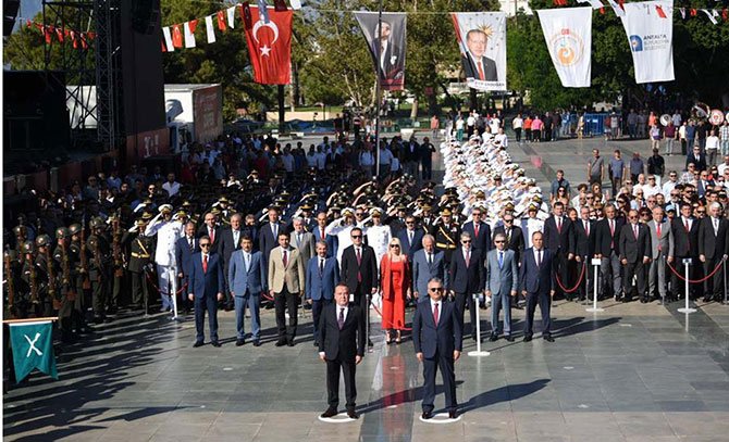 Büyük Zaferin 100 üncü yılı kutlamaları tüm yurtta olduğu gibi Antalya'da da coşkuyla kutlandı. 30 Ağustos Zafer Bayramı’nın 100’üncü yıl dönümü kutlamalarına Vali Ersin Yazıcı’nın yanı sıra Milletvekilleri, Büyükşehir Belediye Başkanı Muhittin Böcek, Cumhuriyet Başsavcısı Zafer Koç, Akdeniz Üniversitesi Rektörü Prof.Dr. Özlenen Özkan, Vali Yardımcıları, Kaymakamlar, Kamu Kurum Müdürleri, Sivil Toplum Kuruluşu Temsilcileri ve çok sayıda vatandaş katıldı. Kutlamalar ilk olarak Vali Yazıcı ve Büyükşehir Belediye Başkanı Böcek’in Cumhuriyet Meydanı'nda bulunan Ulusal Yükseliş Anıtı’na çelenk sunumuyla başladı. Saygı duruşu ve İstiklal Marşı’nın okunmasıyla birlikte Cumhuriyet Meydanı'ndaki etkinlik sona erdi.