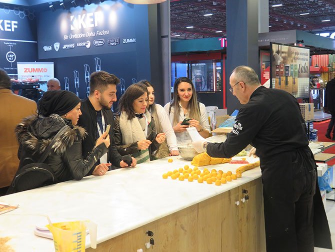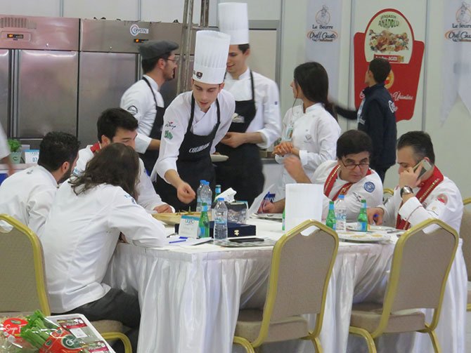 Fuara katılan aşçılar ürünlerin sunulduğu çeşitli standlarda, hünerlerini ortaya koyarken özeillikle eğetim gören öğrenci aşçılar ustalarını soru yağmuruna tuttular.