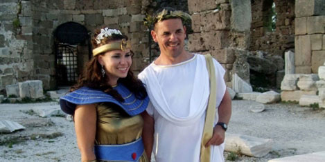 SİDE - Amerikalı polis çift, Roma döneminde Komutan Antonius'un Kleopatra'ya olan aşkının simgesi olarak yaptırdığı Apollon Tapınağı'nda, önce gelinlik ve damatlık, ardından Roma dönemi kıyafetleri giyerek dünyaevine girdi.