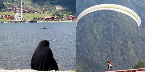 Ülkelerindeki aşırı sıcaklardan bunalan Arap turistler tatil için Trabzon’un yemyeşil yaylalarını geziyor. Türkiye’nin ve Doğu Karadeniz Bölgesi’nin en önemli turizm merkezlerinden biri olan Uzungöl’de sıcaktan bunalan turistler, yamaç paraşütü ile birlikte Uzungöl’ü yukarıdan izlemenin keyfini çıkartıyor.