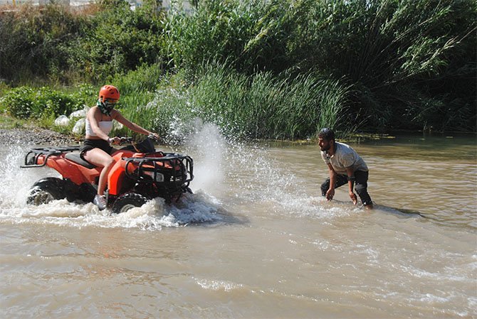 Manavgat Sarılar Mahallesinde ATV Quad Buggy turuna çıkan turistler tur bitiminde sıcak ve nemli havada bulunan turcular Sarılar Deresi'nde ıslanarak serinliyor.
