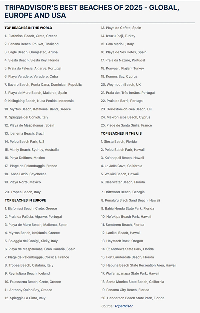 Dünyanın en iyi 25 plajı için yapılan Travellers' Choice ödüllerinin sonuçlarına göre, birinci sırayı Yunanistan’ın Girit'teki Elafonisi Plajı aldı. Dünya genelindeki sıralamada Tayland'daki Banana Plajı, Aruba'daki Eagle Plajı, Florida'daki Siesta Plajı ve Portekiz'deki Praia da Falésia ilk sıralarda yer aldı.