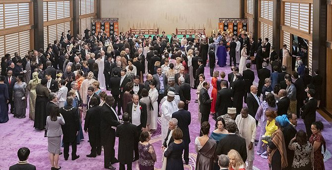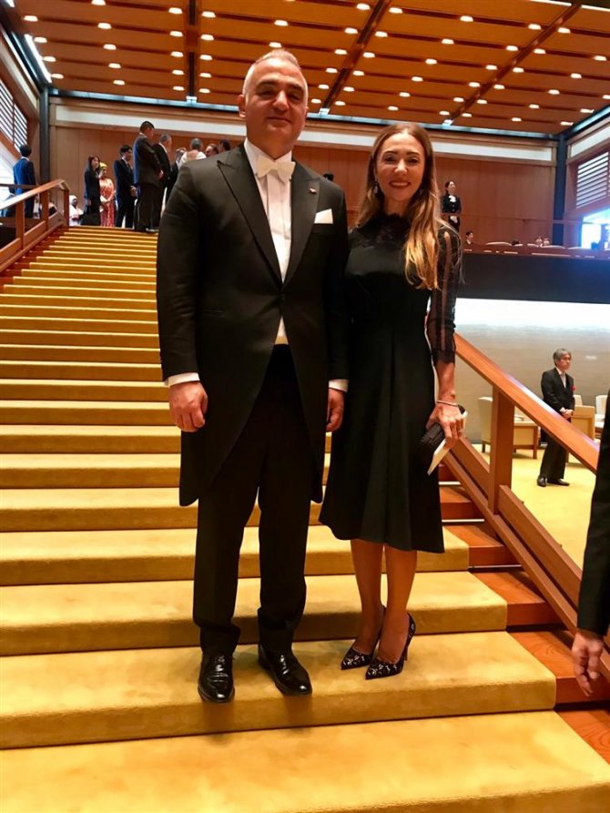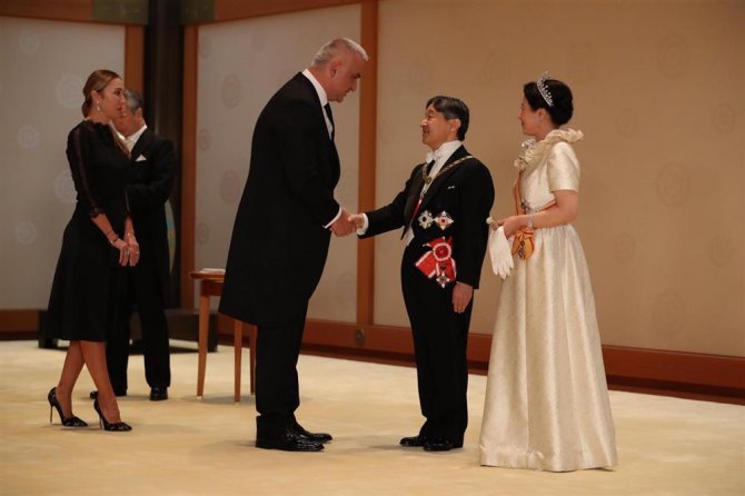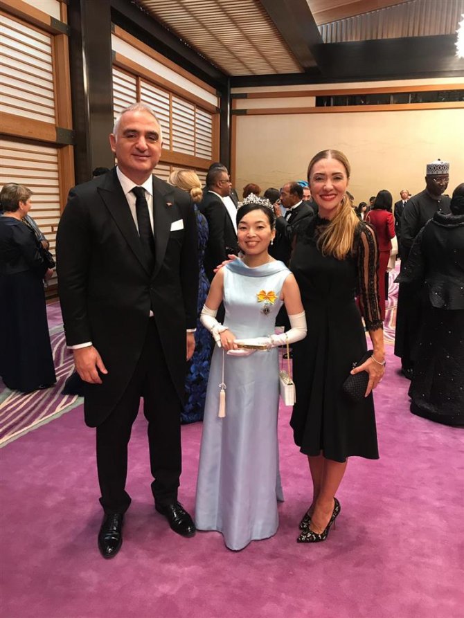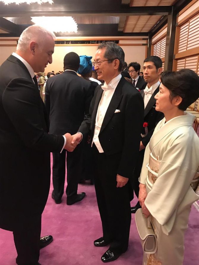 Japon İmparatoru Naruhito ve İmparatoriçe Masako'yu İmparatorluk Sarayı’nda eşi Pervin Ersoy ile birlikte ziyaret eden Bakan Mehmet Nuri Ersoy katıldığı törende Başbakan Abe Şinzo ile de tokalaşarak, Japonya’nın üst düzey davetlileriyle bir araya geldi.