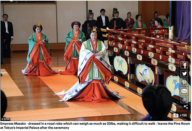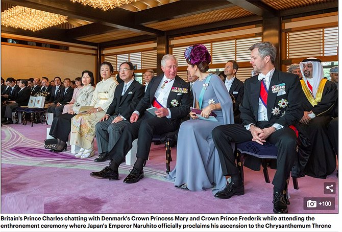 190 ülke ve uluslararası kuruluştan 2 bine yakın kişinin katıldığı törende, 59 yaşındaki Naruhito, törende "Korozen no go ho" adı verilen ve 9’uncu yüzyılda imparatorların giydiği kahverengi tonlarında kuşaklı geleneksel bir elbise giydi.
