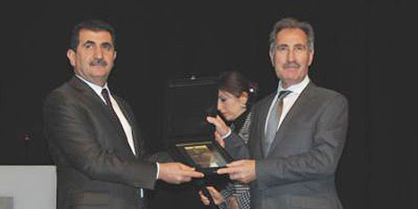 Gediz Üniversitesi Mütevelli Heyeti Başkanı Abdullah Kavuk, Bakan Günay'a plaket takdim etti. Bakan Günay da münazaraya katılan öğrencilere hediye verdi. - İzmir