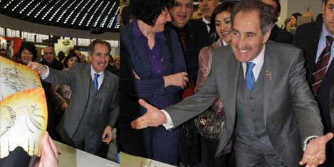 Stantta Bakan Günay ve Bradiç'in yakalarına nazar boncuğu takıldı. Günay, Türk standındaki tanıtım kitapçıklarını inceledi.