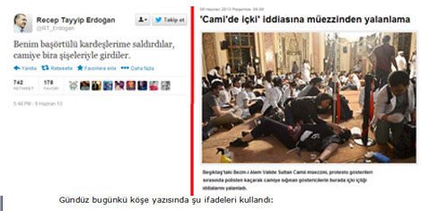 İSTANBUL- Başbakan’ın “Camiye ayakkabı ile girdiler içki içtiler” iddiasını caminin müezzini yalanlarken, Yeni Şafak yazarı Süleyman Gündüz, 'camide içki' iddiası hakkında gerçekleri yazdı. Caminin bahçesinde bölgedeki tinerciler tarafından atılan bira kutusunu“Camide içki içtiler” şeklinde değerlendiren Başbakan’ı kınayanlar “Caminin müezzini her sabah bahçeden tiner şişeleri ve benzerlerini topluyor. Bu bölgede tinercilere karşı güvenlik zaafı var. Bu gibi şeylerin Taksim Gezi Parkı direnişçileri ile ilgisi yoktur” dediler. Öte yandan internette camiye ayakkabılarını çıkararak girenlerin fotoğrafları yayınlandı.