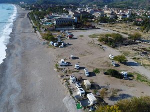 ANTALYA - Kemer'e bağlı Çamyuva Mahallesi sahil kısmında ve 5 yıldızlı otellerin yanı başındaki günübirlik, denize sıfır alan Türkiye'nin birçok ilinden gelen karavancılarla doldu.