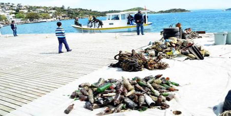 Dalgıçların dört saat süren çalışmasıyla denizden; pet şişe, bira ve alkollü içki kutuları, tabak, çaydanlık, çatal, sandalye ve güneşlik gibi 1 tona yakın çöp çıktı.