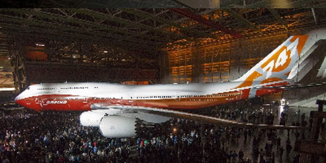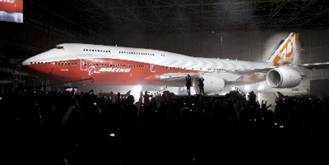 Yeni 747-8 uçağın, Boeing'in Everett - Washington'daki tesislerinde düzenlenen prömiyerine, yaklaşık 10 bin kişilik davetli grubu katıldı.