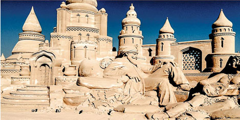 Çöllerden getirilen kumlar, ince bir işçilikle Alaaddin’in sihirli lambasındaki cini ya da Binbir Gece Masalları’ndaki diğer mitolojik yapılara dönüşüyor