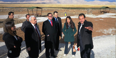 Projeyi yerinde incelemek amacıyla Çaldıran’a giden DAKA Genel Sekreteri Dr. Emin Yaşar Demirci, ilk olarak Hükümet Konağı’nda İlçe Kaymakamı İbrahim Dündar’ı makamında ziyaret etti. DAKA İzleme ve Değerlendirme Birim Başkanı Halil İbrahim Güray ve proje danışmanı Yüzüncü Yıl Üniversitesi (YYÜ) Araştırma ve Uygulama Çiftlik Müdürü Doç. Dr. Şenol Güzel’in de hazır bulunduğu heyetprojenin son durumu ile ilgili bir değerlendirme toplantısı yaptı. Kaymakam Dündar, beraberindeki Genel Sekreter Demirci ve diğer yetkililerle birlikte Doğubeyazıtkarayolu yolu üzerinde bulunan Kaz Gölü’nde yapımı devam eden inşaat alanında incelemelerde bulundu. Dündar ve Demirci, çalışmalar hakkında yüklenici firma yetkilisi Vedat Akçay ve diğer yetkililerden bilgi aldı.