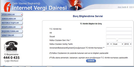 Borç Bilgilendirme Servisi Hizmeti ile T.C. kimlik bilgilerini kullanarak vergi dairelerine intikal etmiş olan bütün borçlar ''www.gib.gov.tr''den öğreniliyor.