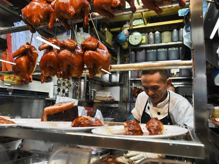 The dish: Hainanese chicken rice, tender slices of boiled bird served over rice cooked in stock.