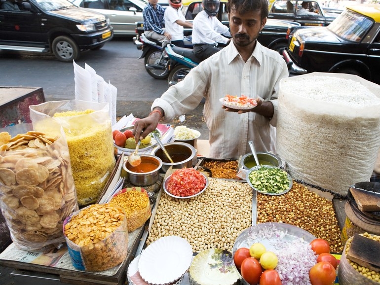 The scene: The only thing more colorful than India’s savory snacks, or chaat, are the hand-painted carts from which they’re sold. Just a few cents buys multi-layered vegetarian delights like vada pav, a spiced mashed potato ball stuffed into a fluffy slider-esque bun smeared with tamarind and/or garlic chutney. If you’re concerned about hygiene, eat only at stands where the vendor prepares the food to order; avoid thin sauces (they may be watered down with contaminated H20), and always carry hand sanitizer.