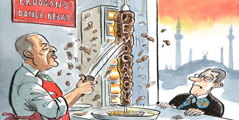 Peter Schrank’ın imzasını taşıyan karikatürde, Başbakan Erdoğan üzerinde Türk bayrağı olan bir önlükle, üzerinde ‘Demokrasi’ yazan bir döner kebabı paramparça kesiyor ve karşısındaki bir AB yetkilisi de memnuniyetsiz olduğu anlaşılan bir ifadeyle Başbakan Erdoğan’ı izliyor. Mekân olarak İstanbul’un seçildiği arka plandaki cami görüntüsünden belli olan karikatürde, Erdoğan’ın döner kestiği yerde “Erdoğan’ın Döner Kebapçısı” levhası asılı.