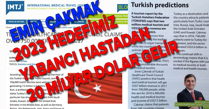 - Türkiye Sağlık Turizmi Konseyi –THTC Kurucu Başkanı Emin Çakmak, dünya sağlık turizminin etkili yayın organı Uluslararası Medikal Seyahat Gazetesi (IMTJ) – International Medical Travel Journal’e Türkiye’nin 2023 yılında 20 milyar dolar sağlık turistine ulaşacağını söyledi. Türkiye Otelciler Federasyonu –TÜROFED’in bu hedefe ulaşmak için Türkiye’ye ye 2 milyon sağlık turistinin geleceği söylemine katılan Emin Çakmak, 2018 yılında 800 bin sağlık turisti 7.5 milyar dolar bırakacağını söyledi.