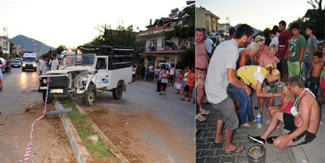 Kaza Süleyman Demirel Bulvarı Zincirlikavak mevkiinde dün saat 19.30 sıralarında meydana geldi. Safari turuna katılan İngiliz turistleri kaldıkları otele götüren Soner Üçpınar idaresindeki 48 GC 203 plakalı cip, iddiaya göre plakası alınamayan başka bir otomobilin sıkıştırması sonucu yoldan çıktı. Önce refüje, ardından aydınlatma direğine çarpan cip devrildi. Kazada sürücü ile araçta bulunan turistler Ryan Janes (39), Dawn Janes (39), Harrison Janes (12), Mattemew Cherrill (38), Mason Cherrill (10), Jolie ann Whitaker (55), Paul Whitaker (56), Manita Burgin (37), Lyadson Holt (39), Jack Holt (11), Cristoher Aitchanson (37), Georgina Aitchanson (6) yaralandı. Devrilen aydınlatma direği yol kenarında bulunan fırının içine düşerken, fırında şans eseri yaralanan olmadı. Kaza sonrası trafiğe kapanan yolda adeta can pazarı yaşandı. Kaza yerine çok sayıda ambulans sevk edilirken, yola savrulan yaralıların yardımına çevredeki vatandaşlar koştu.