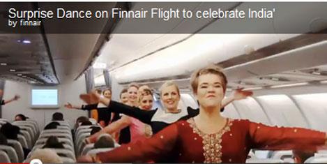 Helsinki – Yeni Delhi seferini yapan uçakta, Bollywood tarzı danslarla karşılanan yolcular, dansçılara alkışlarla eşlik. Dansçılar daha sonra uçağı Yeni Delhi’ye uğurladı.