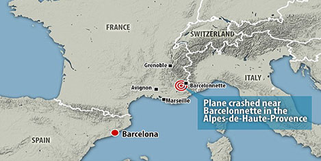 Uçağın, Digne ve Barcelonnette isimli yerleşim bölgeleri arasında düştüğü belirtildi.