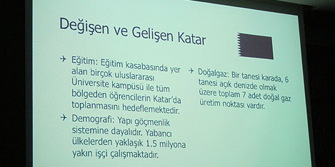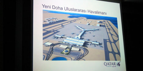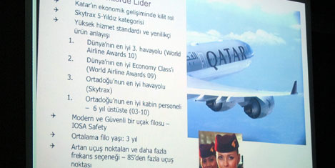 Toplantıda Katar Havayollar'ının Türkiye ofisinden Şebnem Aydemir tarafından şirketin yenilikçi ve değişen yapısı anlatıldı. Bu arada her yıl öldığı ödüllerle dünyanın ilk 5 havayolu içinde yer aldığıni anlatan kısa bir barkovizyon ve TAV tarafından yapılan Doha Havalimanı'nın maketi gösterildi.