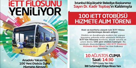 İstanbul Büyükşehir Belediye Başkanı Kadir Topbaş'ın katılımıyla yapılacak 100 yeni aracın İstanbul geneline dağıtım töreni, 10 Ağustos Cuma günü saat 14.30 da Sultanbeyli itfaiye binası yanında gerçekleştirilecek.