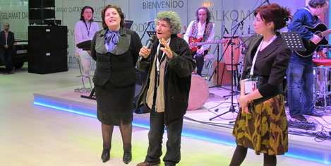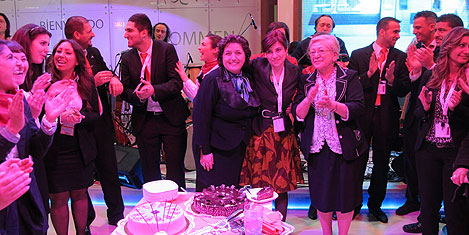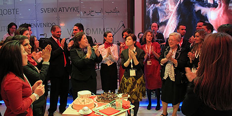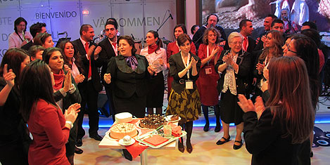 BERLİN/ALMANYA- Türkiye"nin Berlin Kültür ve Turizm Müşaviri Gözde Şahin yeni yaşını ITB Berlin Fuarı"nda tüm müşavirlik çalışanlarının katıldığı şenlik ve orkestranın çaldığı doğum günü şarkısıyla kutladı. Daha sonra ise doğum günü pastası kesildi. Başta Gözde Şahin olmak üzere tüm çalışanlar orkestranın çaldığı müziklere uyarak sahnede dansettiler.
