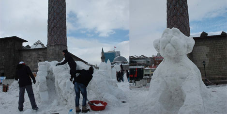 ERZURUM - Ağır kış şartlarının hüküm sürdüğü Erzurum'da kar kütleleri üniversite öğrencileri tarafından sanat eserlerine dönüştürüldü.