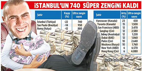 İstanbul'un, serveti 30 milyon doların üzerindeki ‘kaymak tabakası' 1 yıl içinde yüzde 22 eridi. Bu oranla İstanbul, dünya kentleri içinde ‘ultra zengin' sayısının en çok azaldığı şehir oldu.