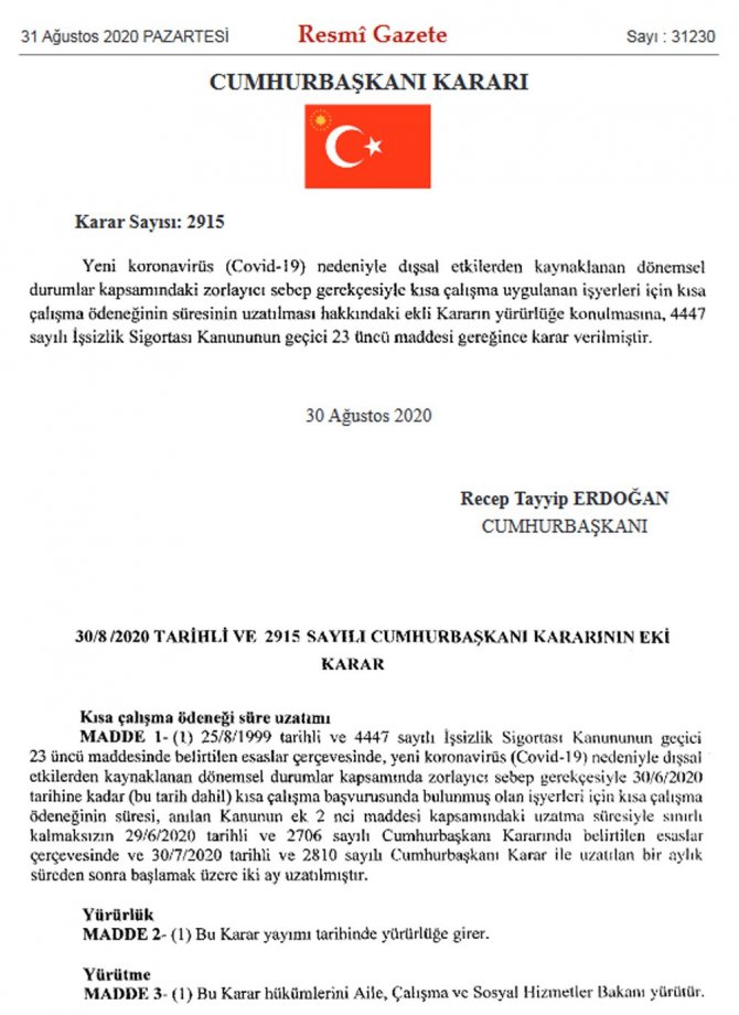 ANKARA-Kısa çalışma ödeneği uygulamasının 2 ay daha uzatılmasını öngören Cumhurbaşkanı kararı Resmi Gazete’de yayımlandı.