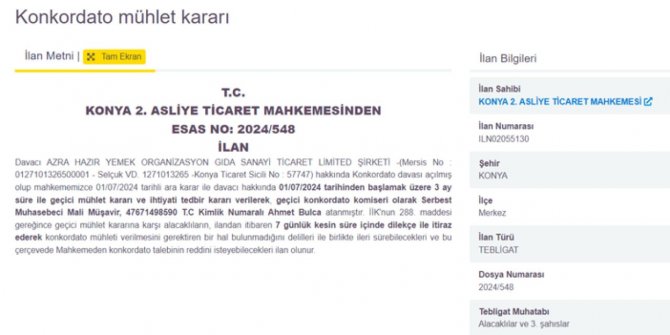 Davacı Azra Hazır Yemek Organizasyon Gıda Sanayi Ticaret Limited Şirketi -(Mersis No : ******- Selçuk VD. ****** -Konya Ticaret Sicili No : ******) hakkında Konkordato davası açılmış olup mahkememizce 01/07/2024 tarihli ara karar ile davacı hakkında 01/07/2024 tarihinden başlamak üzere 3 ay süre ile geçici mühlet kararı ve ihtiyati tedbir kararı verilerek, geçici konkordato komiseri olarak Serbest Muhasebeci Mali Müşavir, ****** T.C Kimlik Numaralı Ahmet Bulca atanmıştır. İİK'nun 288. maddesi gereğince geçici mühlet kararına karşı alacaklıların, ilandan itibaren 7 günlük kesin süre içinde dilekçe ile itiraz ederek konkordato mühleti verilmesini gerektiren bir hal bulunmadığını delilleri ile birlikte ileri sürebilecekleri ve bu çerçevede Mahkemeden konkordato talebinin reddini isteyebilecekleri ilan olunur.