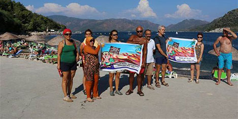 Geçen hafta da benzer bir eylem yapan grup üyeleri, turistlerin yattığı şezlonglar arasına havlularını sererek oturmuştu.