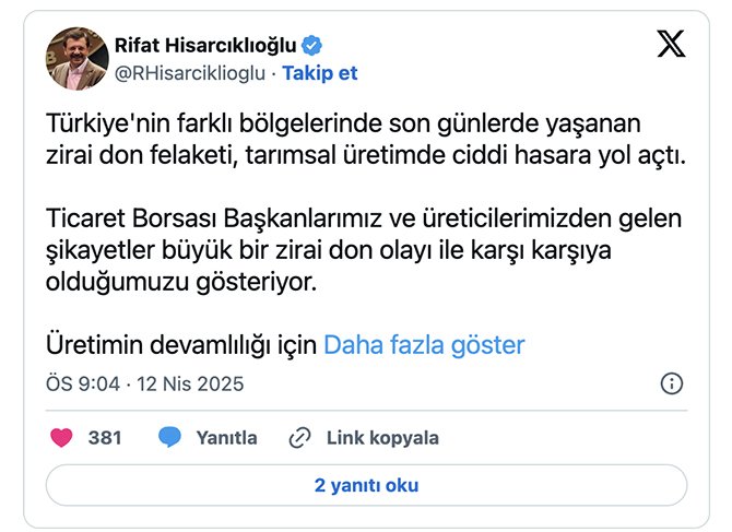 ANKARA - Türkiye’nin çeşitli bölgelerinde etkili olan zirai don felaketi, tarım sektöründe büyük kayıplara yol açtı. TOBB Başkanı Rıfat Hisarcıklıoğlu, üreticilerin desteklenmesi gerektiğini vurgularken, kamu ve bankalara önemli TOBB Başkanı Rıfat Hisarcıklıoğlu, son günlerde Türkiye’nin farklı bölgelerinde etkili olan zirai don felaketiyle ilgili önemli açıklamalarda bulundu. Ticaret Borsası başkanlarından ve çiftçilerden gelen geri bildirimler doğrultusunda büyük bir doğal afetle karşı karşıya olunduğunu belirten Hisarcıklıoğlu, tarımsal üretimin ciddi şekilde etkilendiğine dikkat çekti.