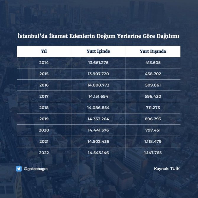 Yurt dışı doğumlu vatandaşların toplam vatandaşlara oranı yüzde 7,2'ye çıkarken, sığınmacılar ve düzensiz göçmenlerle birlikte İstanbul nüfusunun yaklaşık yüzde 17'si yurtdışı doğumlular veya yabancılardan oluşuyor.