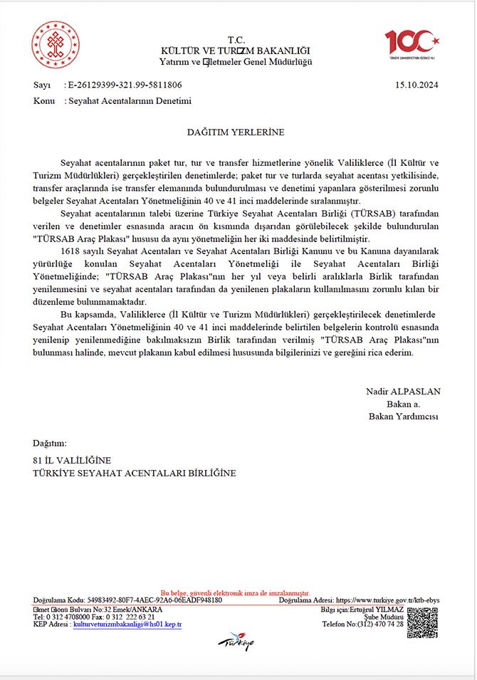 Bu kapsamda, Valiliklerce (II Kültür ve Turizm Müdürlükleri) gerçekleştirilecek denetimlerde Seyahat Acentaları Yönetmeliğinin 40 ve 41 inci maddelerinde belirtilen belgelerin kontrolü esnasında yenilenip yenilenmediğine bakılmaksızın Birlik tarafından verilmiş "TÜRSAB Araç Plakası"nın bulunması halinde, mevcut plakanın kabul edilmesi hususunda bilgilerinizi ve gereğini rica ederim.