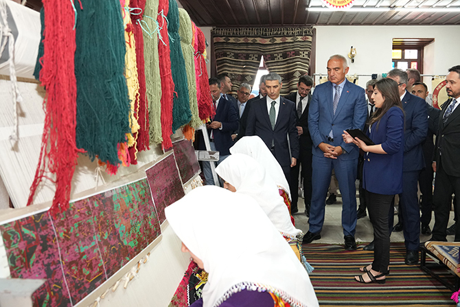 Uşak Valisi Dr. Naci Aktaş’tan şehrin kültür ve turizm projelerine ilişkin detaylı bilgiler alan Bakan Ersoy, ardından Uşak İl Özel İdaresinin Dokunan Eller Halı Kilim Evi'ni ziyaret etti ve kadınların yöresel dokuma çalışmalarını yerinde inceledi.