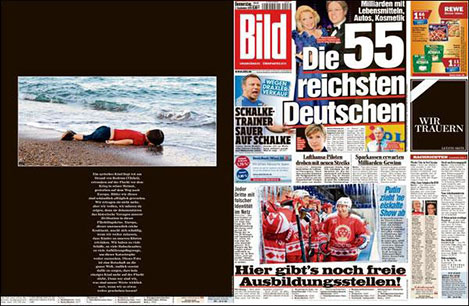 Almanya'nın en çok satan gazetesi Bild, Aylan'ın fotoğrafını siyah bir zemin üzerinde arka sayfasından okurlarıyla paylaştı. Fotoğrafın altına ise şu notu düştü: "Bunun gibi görseller utanç verici bir şekilde yaygınlaştı. Biz artık katlanamıyoruz ve bu göçmen krizinde uygarlığımızın tarihi başarısızlığını belgelediği için bunları göstermek istiyoruz." Öte yandan, Bild'in internet sitesi de bugünkü arka sayfa tasarımıyla açılıyor.