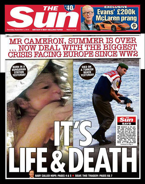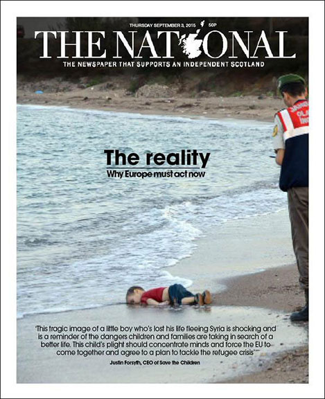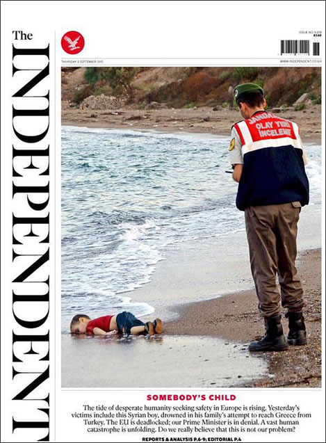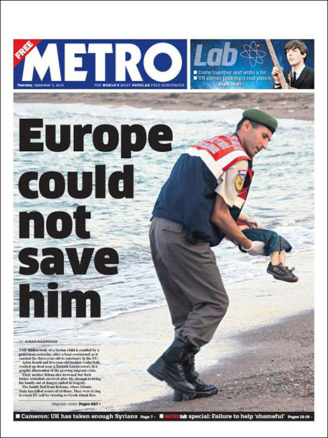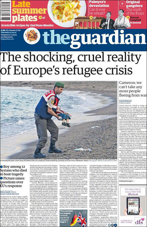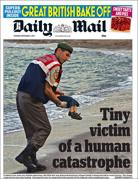 Gazete Avrupa'da İkinci Dünya Savaşı'ndan bu yana en büyük göç akınının yaşandığını, Aylan'ın yürekleri parçalayan fotoğrafının göçün insani maliyetini gözler önüne serdiğini vurguluyor.