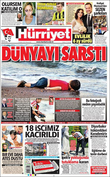 Dünyayı sarsan fotoğrafa manşetinden yer veren HÜRRİYET, Avrupa İnsan Hakları Mahkemesi (AİHM) “İfade özgürlüğü yalnızca hükümetleri değil, toplumu da rahatsız edici, şoke edici, incitici haberlerin verilmesini kapsar” kararını dayanak aldı. HÜRRİYET, Doğan Haber Ajansı Foto-Muhabiri Nilüfer Demir'in çektiği yürek burkan kareyi "Biz de dünyanın gözünü kapattığı mülteci dramına dikkat çekmenin bir gazetecilik görevi olduğu inancıyla bu sarsıcı fotoğrafı manşetten yayınlıyoruz" ifadesiyle paylaştı.