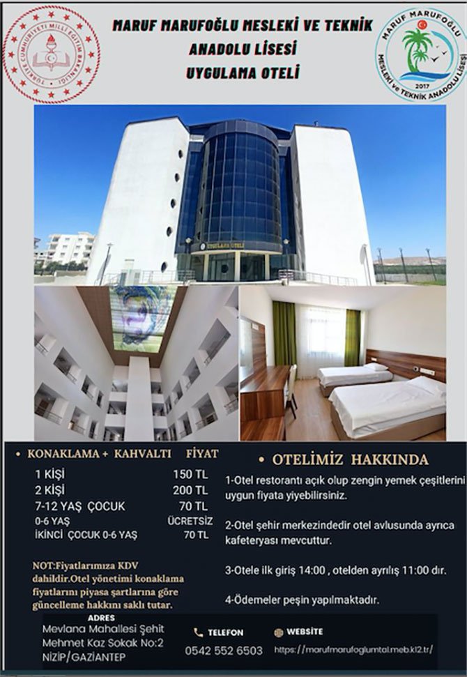 Döner Sermeye İşletmesinin Uygulama Oteli 06 Haziran 2022 tarihi itibarıyla hizmete açıldı. Otele ait tanıtım afiş ve fiyat listesi açıklandUygulama Oteli’nin açılışını Nizip kaymakamı Oğuz Alp Çağlar, Gaziantep Büyükşehir Belediye Başkanı Fatma Şahin, Nizip Milli Eğitim Müdürü Cengiz Gündeş ve diğer yetkililer yaptı.