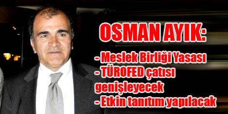 TÜROFED'in önceki günkü genel kurulunda Gürel Aydın'ın listesine karşı yarışarak, seçimi kazanan Osman Ayık, her şeyden önce yeni yönetim kurulu olarak TÜROFED'i 'Türkiye'nin federasyonu' haline getirmeyi hedeflediklerini kaydetti. TÜROFED'i Türkiye'nin her bölgesini kapsayan bir yapıya dönüştürmek istediklerini anlatan Osman Ayık, "TÜROFED, Türkiye'nin örgütü olmak zorundadır. Türkiye Otelciler Birliği'ni de (TUROB) çatımız altında görmek istiyoruz" dedi.