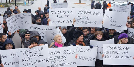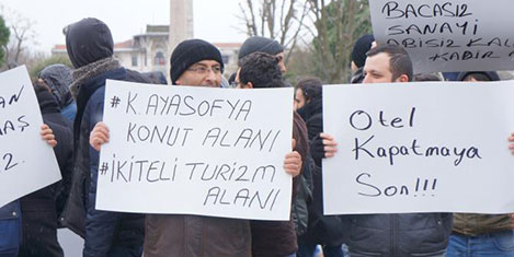İSTANBUL- Sultanahmet-Ayasofya Bölgesi otelcileri, Fatih Belediyesi'nin geçici ruhsatla çalışan otelleri kapatma kararı alması üzerine eylem yaptı. Sultanahmet Meydanı'nda saat 14.00 sıralarında toplanan grup, üzerinde "Turizme mühür vurmayın", "Kapanan otelleri açın", "Hedef 2023, 42 milyon turist nerede yatacak?", "Esnafı mağdur etmeyin" yazılı pankartlar taşıdı ve "Fatih'in demiri duy sesimizi", "Otele ruhsat istihdam demek" şeklinde slogan attı