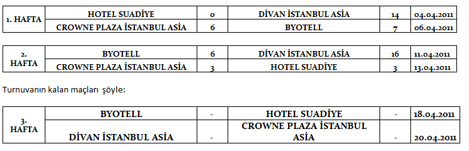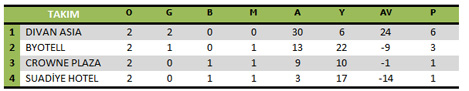 İSTANBUL- Anadolu yakasında bulunan oteller arası futbol turnuvası Byotell, Divan İstanbul Asia, Suadiye Oteli ve Crowne Plaza otellirinin katılımıyla heyecan içinde sürüyor. Yapılan karşılaşmalarda Divan İstanbul Asia 2 galibiyetle liderliğini korurken onu Byotell, Crowne Plaza ve Suadiye Oteli izliyor.