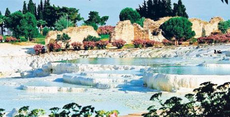 PAMUKKALE- Denizli'de termal suların içindeki kirecin çökeltisiyle oluşan Pamukkale travertenlerinin beyazlığının sürekli akan suyla oluştuğu zannediliyor.