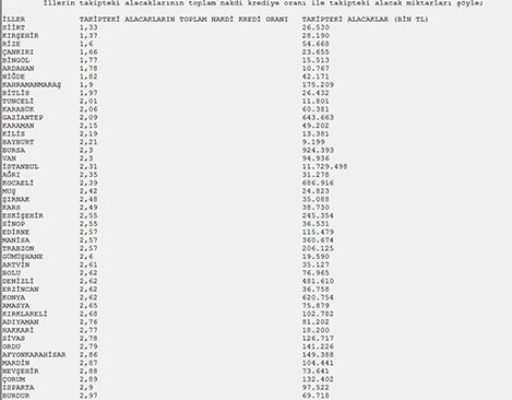 Bu anlamda Siirt'i Kırşehir takip etti. Takipteki alacakların toplam nakdi krediye oranının yüzde 1,37 olduğu Kırşehir'in takipteki alacakları 28 milyon 190 bin lira. Kırşehir'in ardından yüzde 1,6 ile Rize, yüzde 1,66 ile Çankırı, yüzde 1,77 ile de Bingöl geldi.