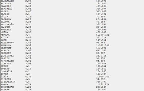 Batman'ı yüzde 5,21 ile Zonguldak takip etti. Zonguldak'ın ardından ise yüzde 4,74 ile Adana, yüzde 4,5 ile Diyarbakır ve Bilecik geldi.