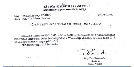 Bakanlık Makamı’nın 31/01/2013 tarihli ve 24040 sayılı Onayı ile 2012 yılında uygulanan rehber taban ücretlerinin Turist Rehberliği Meslek Yönetmeliği yürürlüğe girinceye kadar 2013 yılı için de uygulanması uygun görülmüştür.