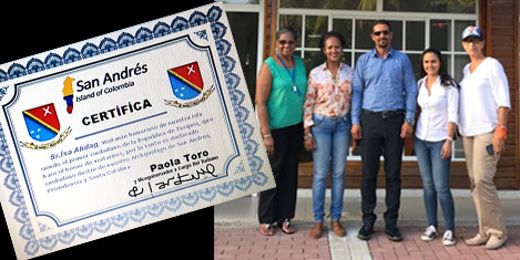 SAN ANDRES / KOLOMBİYA - Karayip Denizi’nde bulunan Kolombiya’nın San Andres Adası’na ilk kez ayak basan Türk turizm yöneticisi olarak Adana Rehberler Odası-ADRO Başkanı ve TUREB yöneticisi İsa Akdağ’a “Onur Belgesi” verildi. Büyüklüğü 26 km2, uzunluğu 12 km olan pırıl pırıl denizi ve kumsalı ile San Andres Adası son yılların en gözde tatil cenneti olarak biliniyor.