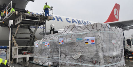 İSTANBUL- Türk Hava Yolları’na ait A310-F kargo uçağına battaniye, yiyecek ve ilaçlardan oluşan toplam 35 ton insani yardım malzemesi yüklendi. Airbus Vakfı, Luftfahrt Ohne Grenzen (LOG), Türk Hava Yolları ve Fraport AG, bugün Türk Hava Yolları’na ait A310-F kargo uçağıyla 35 ton yardım malzemesini Frankfurt Havaalanı’ndan Adana, Türkiye’ye nakletti.
